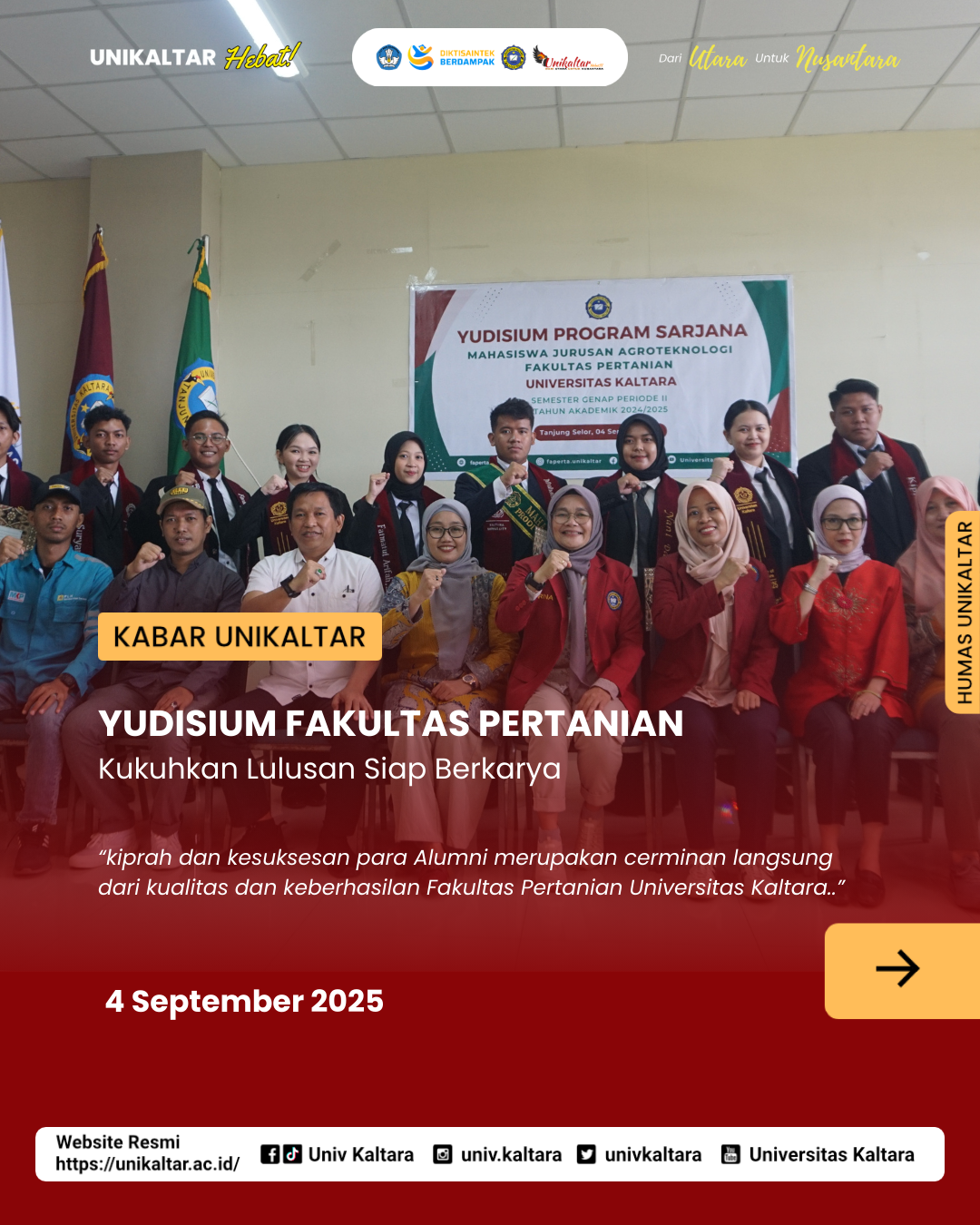 Kamis, 4 September 2025 - Fakultas Pertanian Universitas Kalimantan Utara sukses menyelenggarakan kegiatan Yudisium pada Rabu, 4 September 2025. Acara yang berlangsung khidmat ini menjadi momen penting bagi para mahasiswa yang telah menyelesaikan studi dan resmi dikukuhkan sebagai lulusan sarjana.